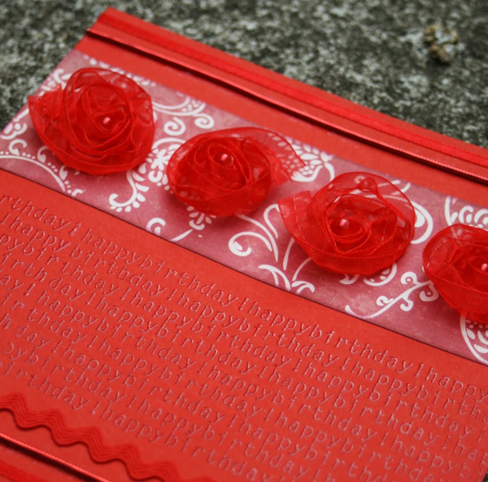 This is a fairly straightforward card to put together so I won't do a step-by-step. The four red roses from May Arts come attached at intervals to the same sheer ribbon which you can use just as it is, but for this card I decided to cut them off the backing (which you can easily do because of the way they are sewn on) and then decorated each one in the centre with a Kaisercraft pearl.
